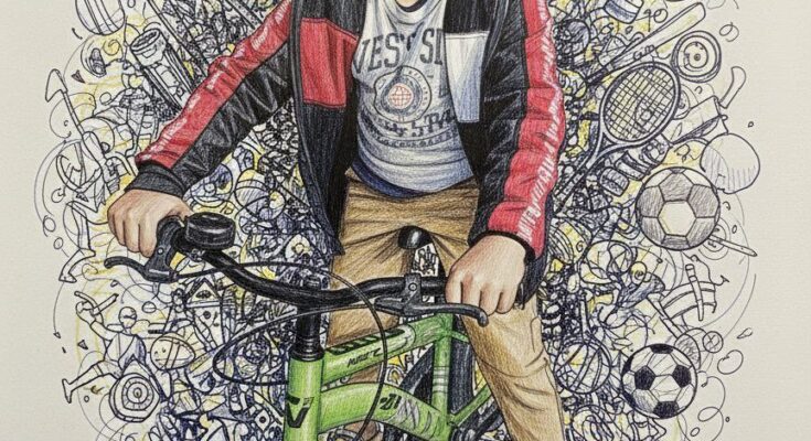 { Without changing the facial features of above image , Convert the above image into ultra realistic portrait of only in a hand drawn illustration in a paper Drawing should be with black and blue, yellow pen shade. Around him should be sports things scribbles and doodle art of sports. He should be elegant artistic asthetic painting}